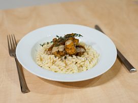 Poté vyjmeme maso, scedíme vývar. Na dvou lžících sádla zpěníme hladkou mouku, promícháme a přilijeme vývar. Vypneme a vmícháme zakysanou smetanu. Vrátíme maso a krátce prohřejeme. Podáváme s těstovinami nebo knedlíkem.
