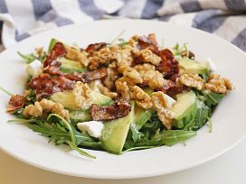 Vydlabejte a nakrájejte avokádo a dejte ho na rukolu. Přidejte kozí sýr, křupavou slaninu a ořechy.