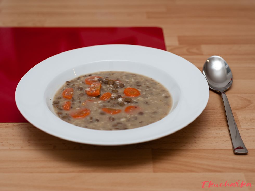 Ve větším hrnci opečeme na sádle ovesné vločky, posypeme vegetou a zalejeme vývarem s uvařenou čočkou a mrkví.