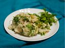 Vařené brambory prošťoucháme s cibulí a sádlem, nakonec přimícháme rukolu.