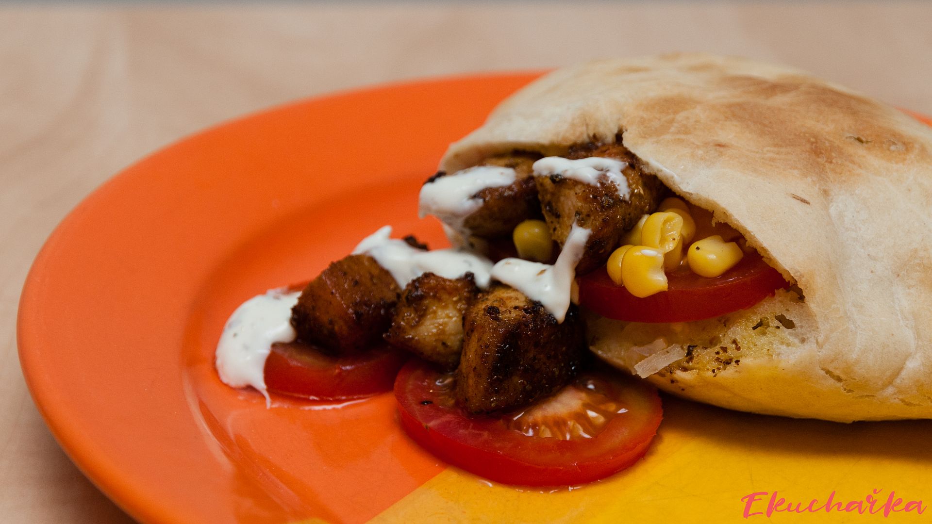 Plníme pita chléb kuřecími kousky, zeleninou a přelijeme česnekovým dresinkem.