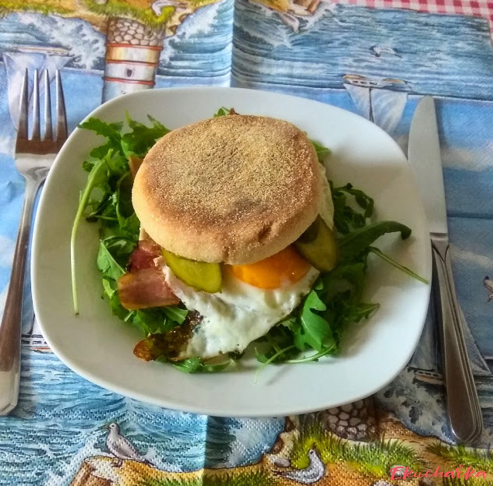 Na pánvi si opečeme anglickou slaninu do křupava a vyndáme z pánve. Na té stejné pánvi si uděláme volské oko, já vejce nesolím.