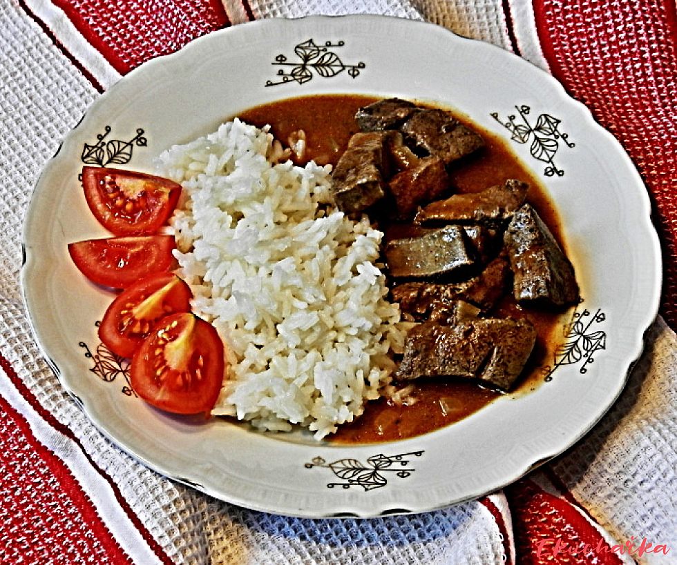 Játra si očistíme a nakrájíme na stejně velké proužky. Na oleji zpěníme cibuli, vložíme játra, okořeníme a necháme zatáhnout. Poté zasypeme dvěmi lžícemi hladké mouky, orestujeme a zalijeme vroucím vývarem nebo bujónem připraveným z kostky.