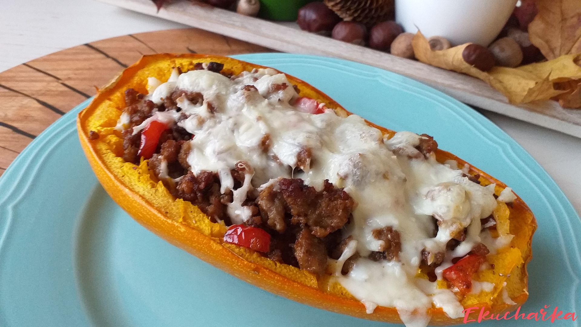 Nejen Hokaido patří mezi oblíbené dýně, ale také špagetová dýně se těší velké oblibě. Zapékat ji můžete na různé způsoby. Dnes tedy s mletým masem a sýrem.