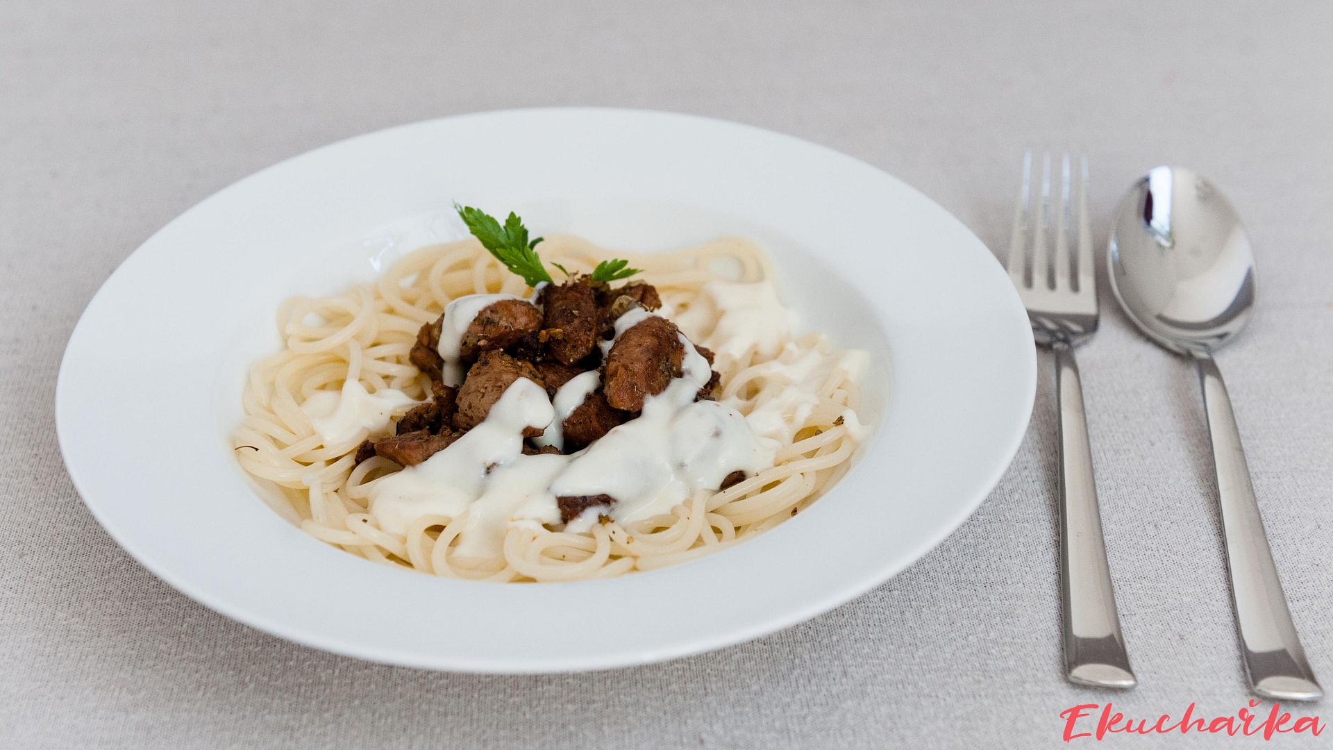 Nachystáme špagety, přidáme orestované sójové nudličky a přeléváme omáčkou.