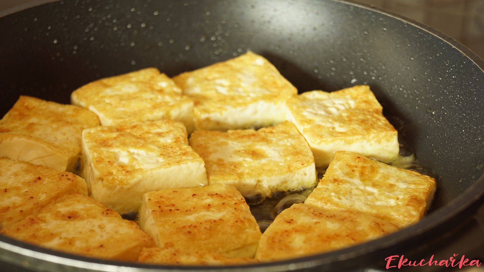Nakrájené tofu osmažte na trošce oleje z obou stran. Poté dejte stranou na papírovou utěrku.