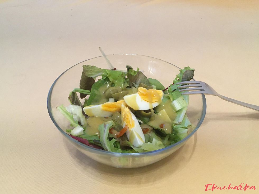 Zeleninu smícháme, přidáme nakrájená vejce a přeléváme dresinkem.