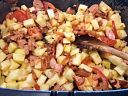 Mezitím si nakrájíme špekáčky a brambory na kostičky a vložíme do hrnce. Chvíli opékáme. Poté zaprášíme paprikou a zalijeme vývarem. Vaříme zhruba 10 minut.