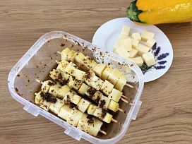- Špízy dáme do krabičky, uzavřeme a lehce protřepeme. Dáme do lednice na několik hodin. Během té doby misku několikrát převrátíme na druhou stranu.