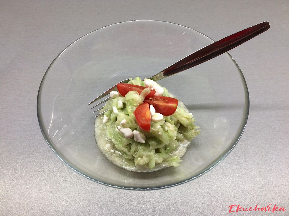 Okurky okrájíme a nastrouháme na hrubém struhadle. Vymačkáme přebytečnou tekutinu. Smícháme s prolisovaným česnekem, solí a pepřem.