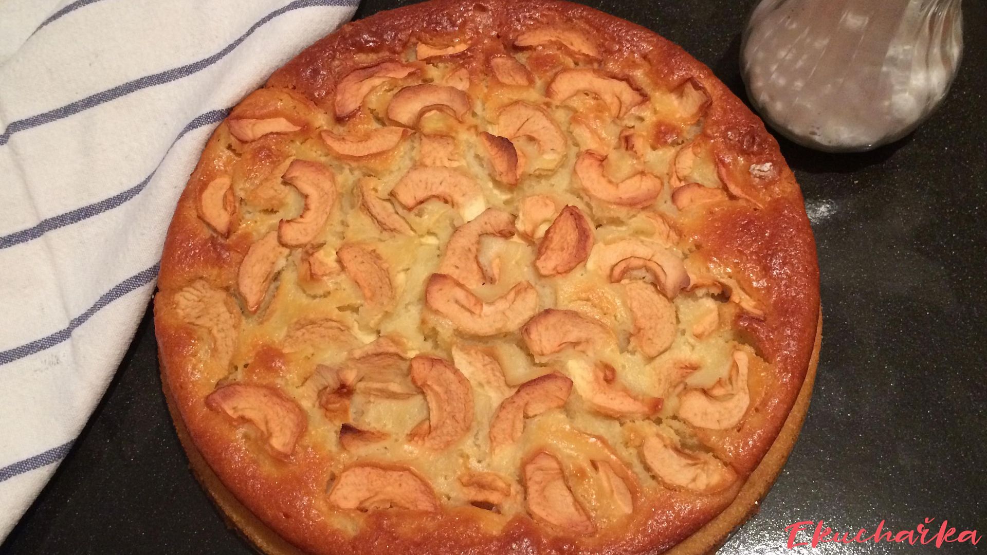 Vymažeme máslem dortovou formu a nalejeme těsto. Nahoru poklademe plátky jablek.