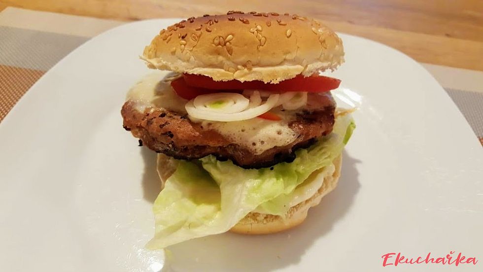 Spodní bulku natřeme majonézou, položíme ledový salát, na to burger, ozdobíme cibulkou na kolečka, paprikou na proužky a přiklopíme vrchní bulkou.