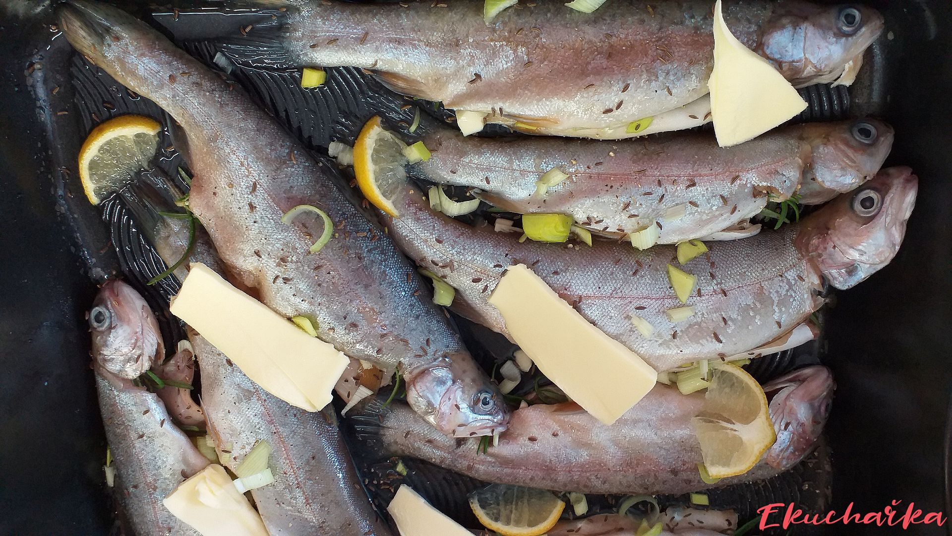 Ryby posypeme celým kmínem, obložíme kolečky citrónu a poklademe plátky másla.