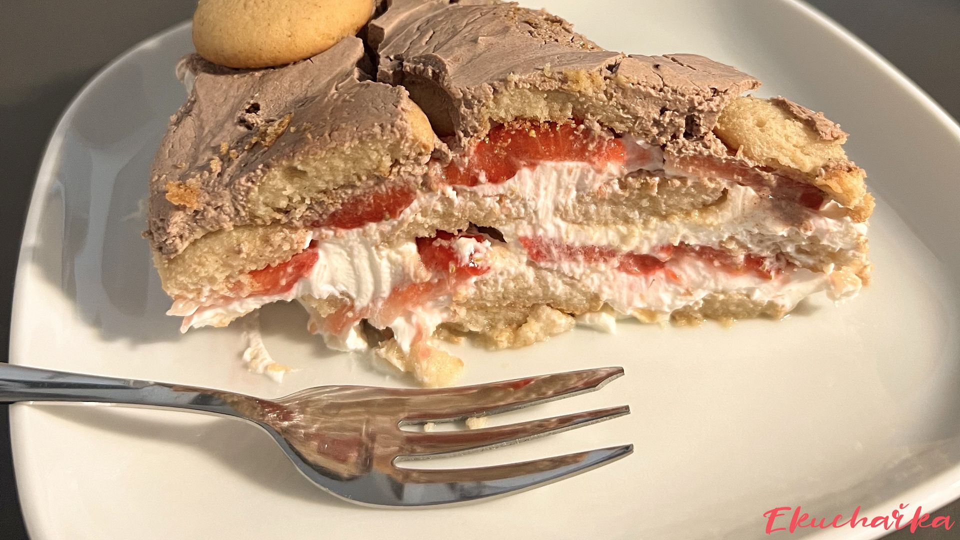 Na piškoty dáme polovinu bílého krému a na něj poklademe plátky jahod, na jahody zase piškoty a další vrstvu bílého krému. Následují opět jahody, piškoty a kakaový krém. Pokud vám zbydou piškoty, tak ještě úplně nahoru můžete položit piškoty.