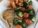 Steak z tuňáka s pečenými batáty a zeleninou