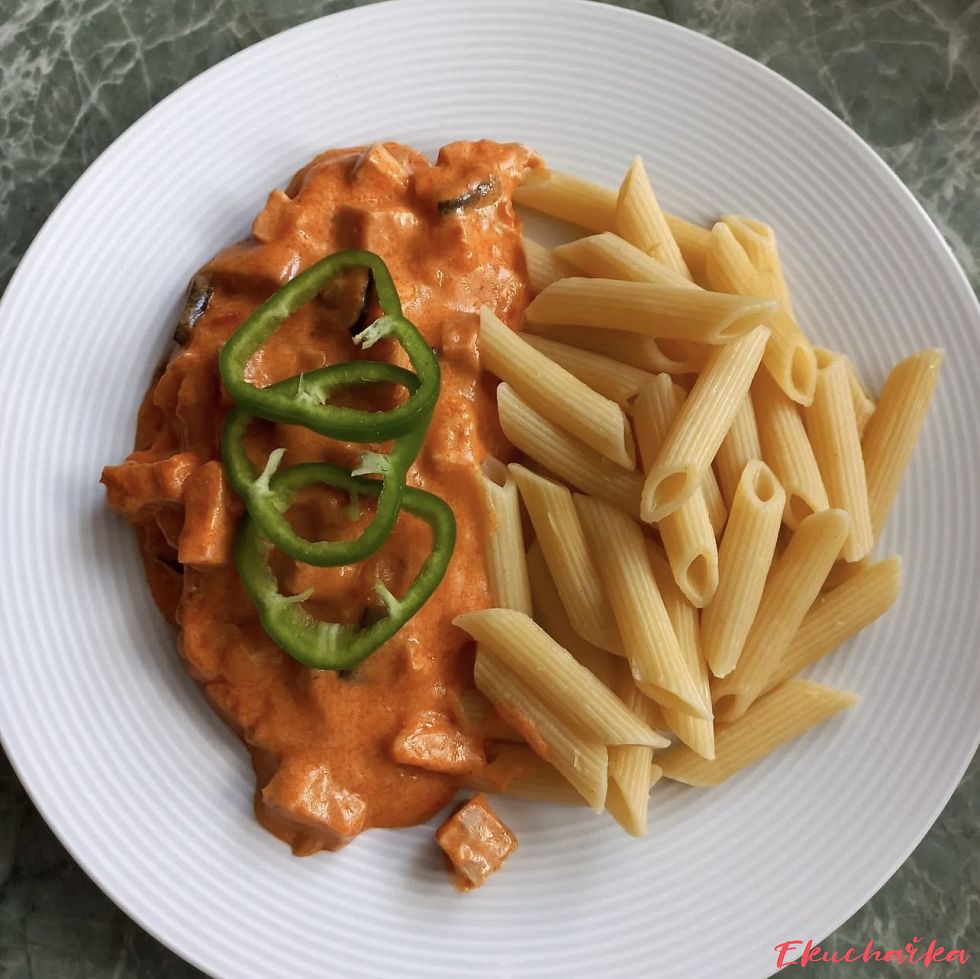 Cuketovou směs podáváme s uvařenými těstovinami. Můžeme ozdobit čerstvými bylinkami nebo zeleninou. Dobrou chuť! :-)