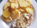 Na brambory uložíme opečené kotlety, posypeme strouhaným sýrem a přikryjeme alobalem.