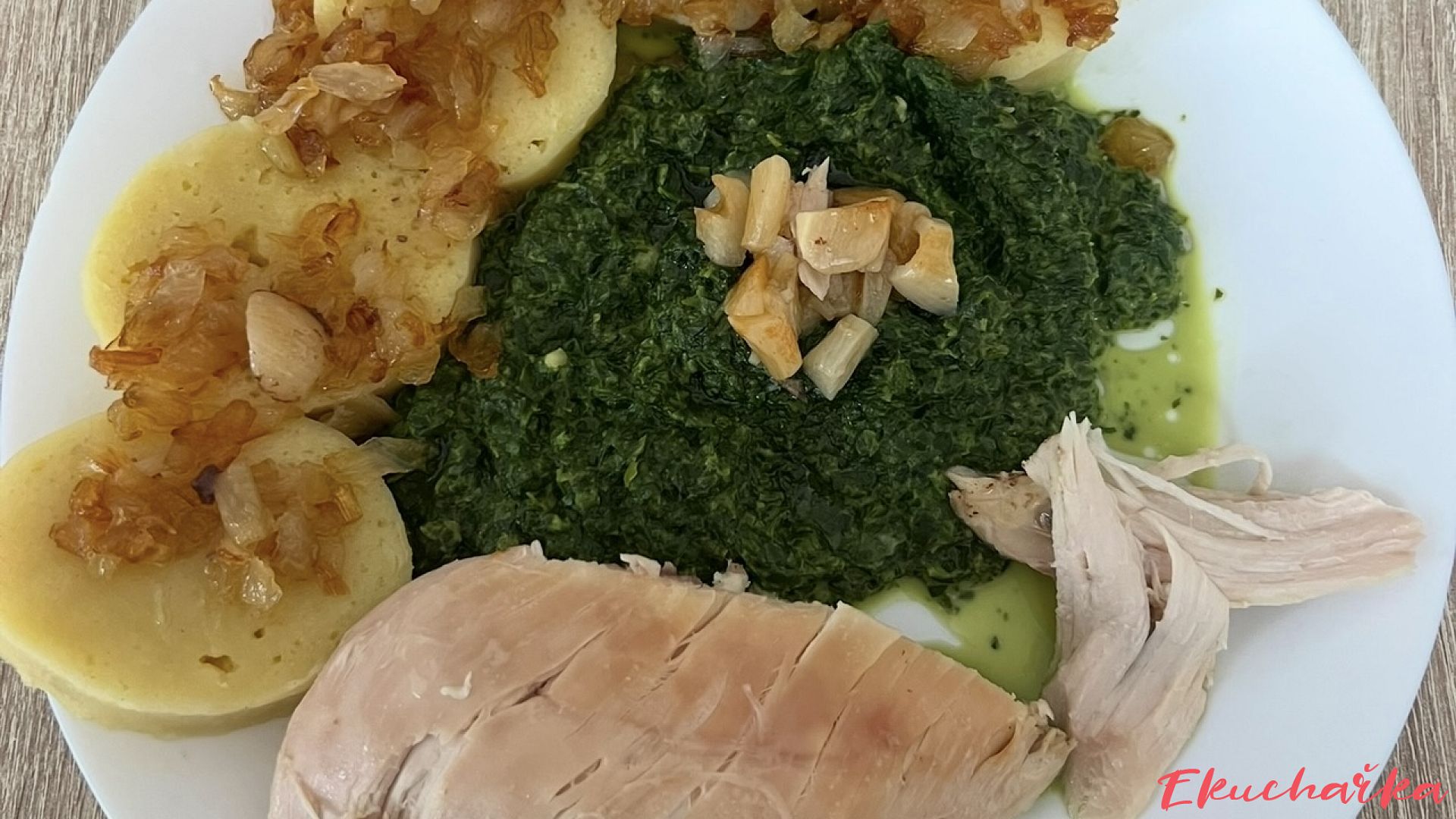 Tradiční česká kombinace jemného kuřecího masa, bramborového knedlíku a dušeného špenátu dostává ještě voňavější podobu díky osmažené cibulce. Pokrm je jednoduchý, sytý a ideální pro nedělní oběd.