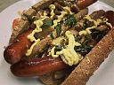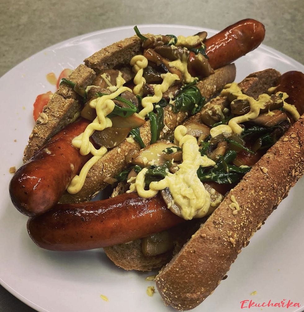 Do ohřáté housky vložíme párek, přidáme vrstvu žampionové směsi se špenátem a navrch přelijeme hořčičnou omáčkou.