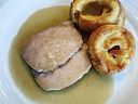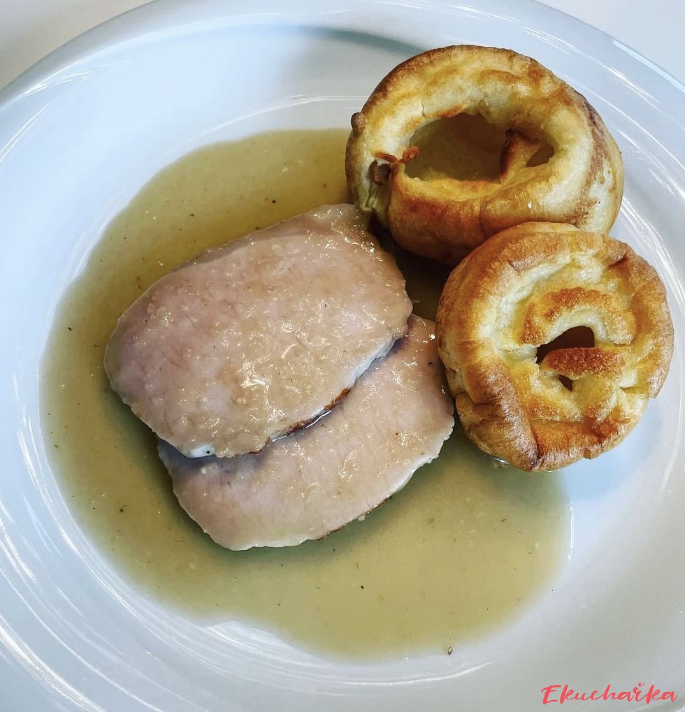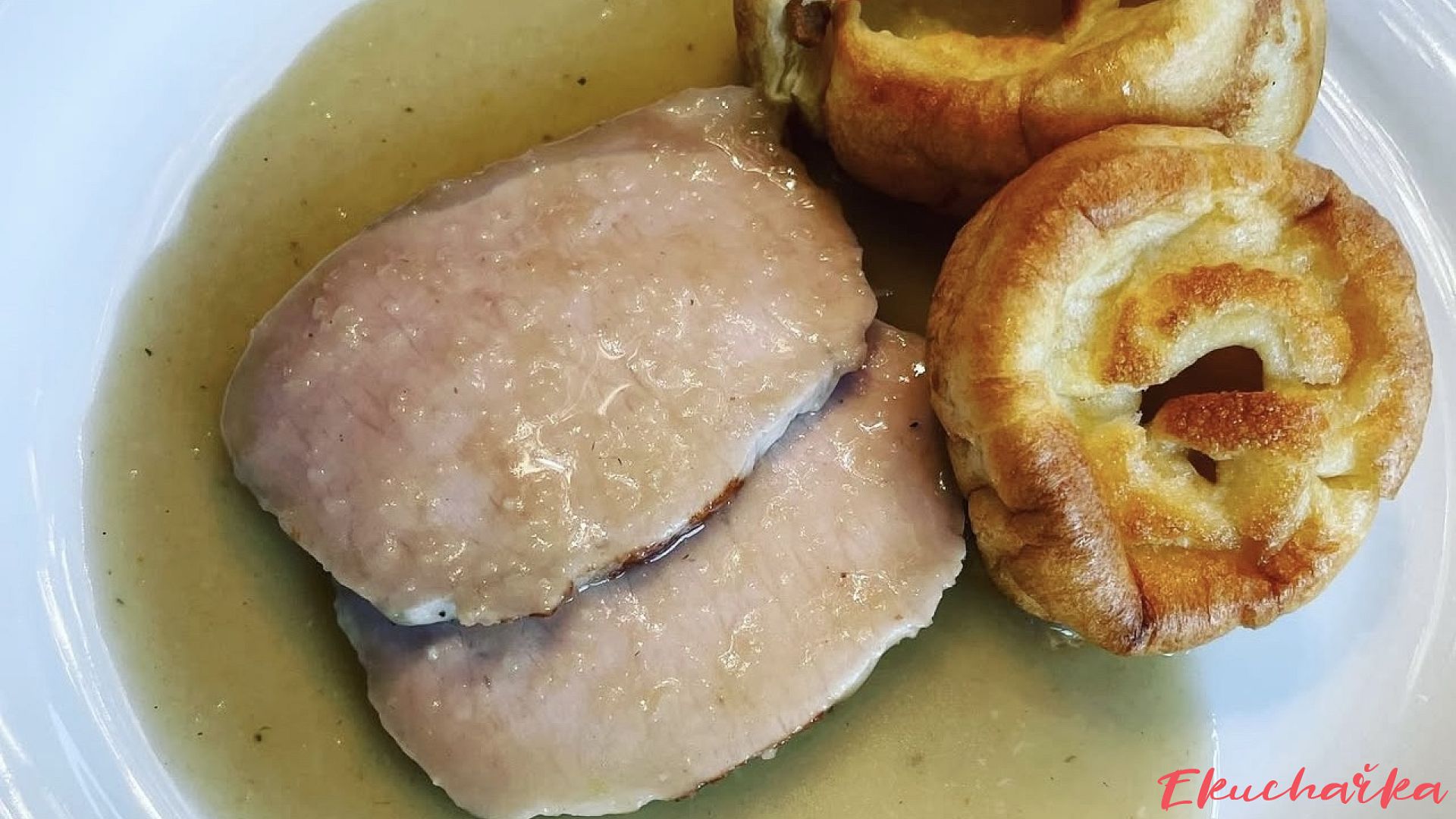 Vepřová pečeně s yorkshirským pudinkem a cibulovou omáčkou