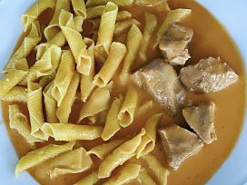 - Podáváme telecí maso s omáčkou a těstovinami.
