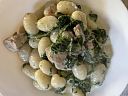 Přidáme gnocchi a promícháme s masem a špenátem.