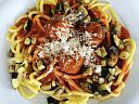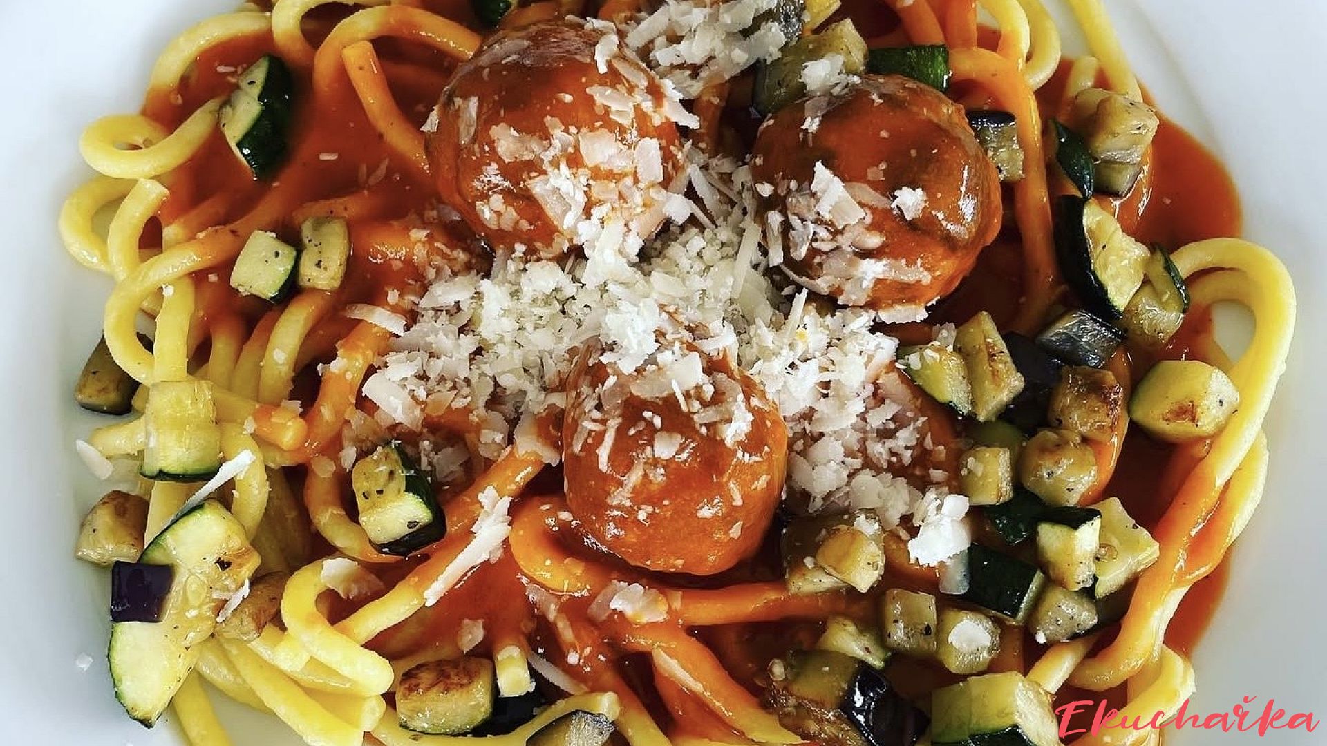 Šťavnaté masové koule dušené v aromatické italské rajčatové omáčce, podávané s těstovinami. Navrch se porce posype křupavou opečenou cuketou, která dá jídlu svěžest a lehce oříškovou chuť.