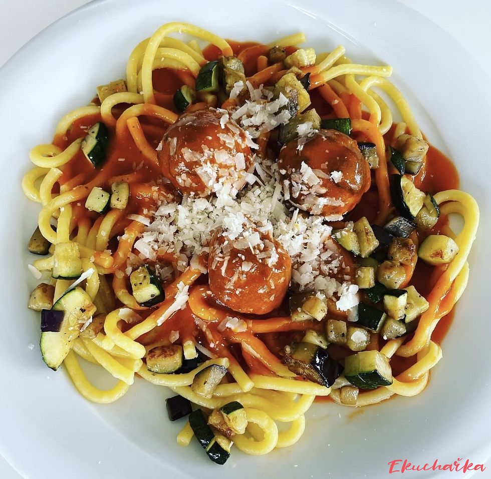 Porce těstovin podáváme s masovými koulemi, přelijeme omáčkou a navrch posypeme opečenou cuketou.