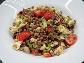 Promícháme čočku se zeleninou, bazalkou a sušenými rajčaty.