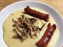 Hrachová kaše s vídeňskou cibulkou a pikantními párky