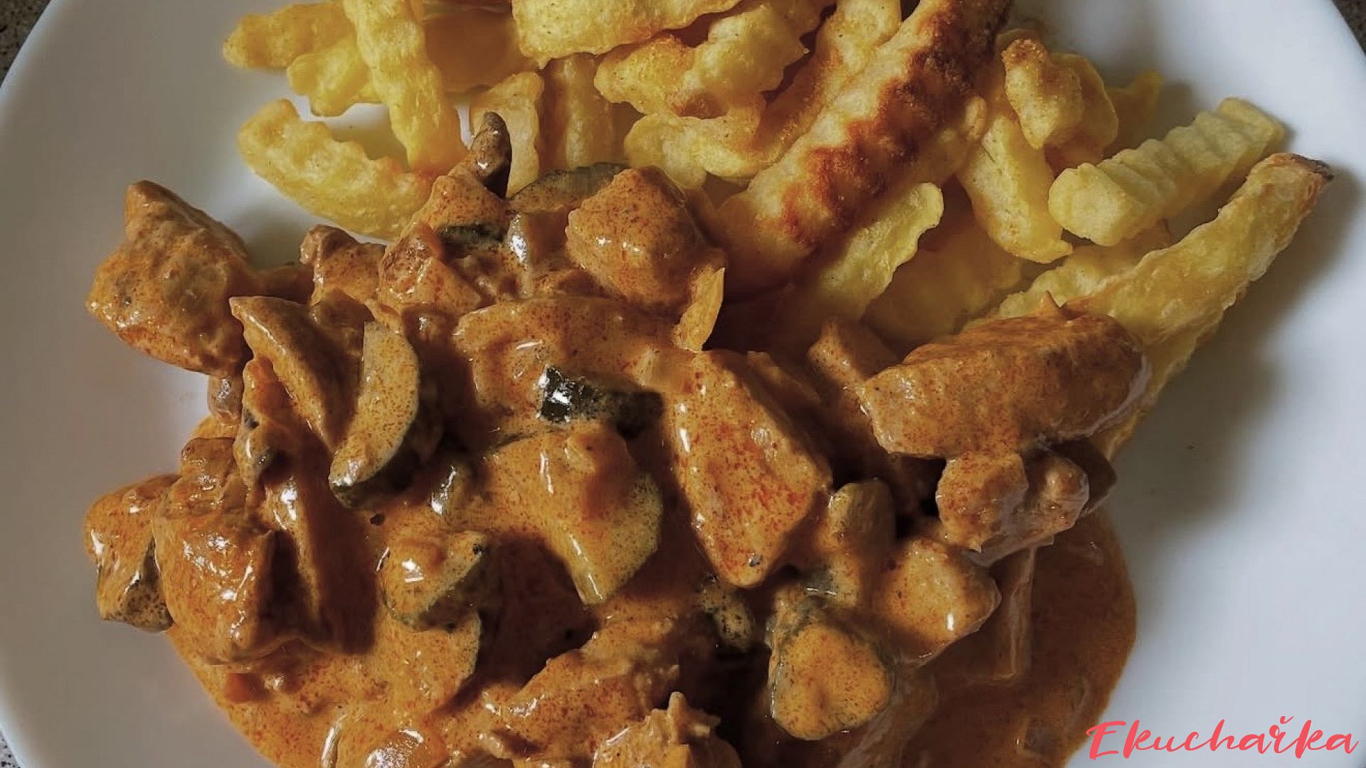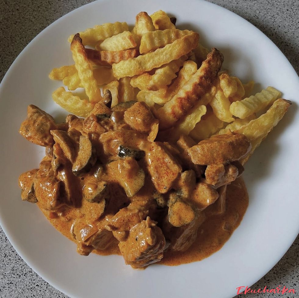 Jemná vepřová panenka v krémové smetanové omáčce s cibulí a houbami, dochucená dijonskou hořčicí a paprikou. Rychlý, vydatný a lahodný pokrm, který se hodí k jakékoliv příloze.