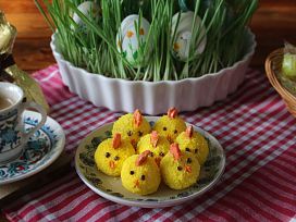 Rozpustíme si bílou čokoládu, kterou mícháme v poměru 2:1 se ztuženým tukem. Následně obarvíme kurkumou, případně žlutým potravinářským barvivem. Z vychlazené kokosové směsi začínáme tvarovat kuřátka. Z malých kousků tvarujeme kuličku, do středu každé dáváme oloupanou mandli bez slupky.