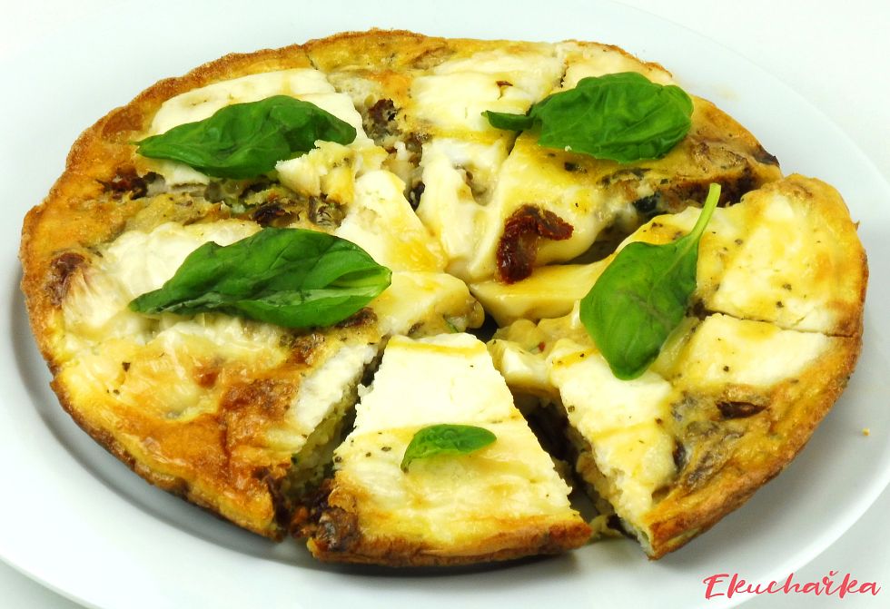 Pánev vymažeme máslem, rozpálíme a vlijeme směs. Jakmile začne směs tuhnout, přidáme rajčata a plátky kozího sýra.