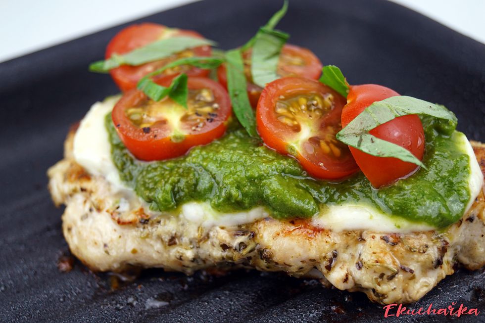 Smíchejte půlky cherry rajčat, citronovou šťávu a bazalku. Každý plátek kuřete s mozzarellou potřete pestem a navrch dejte trošku cherry rajčat a trošku čerstvě napletého pepře.